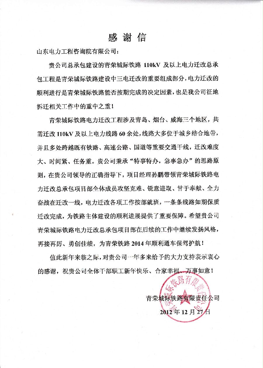青荣城际铁路有限责任公司向我院发来感谢信